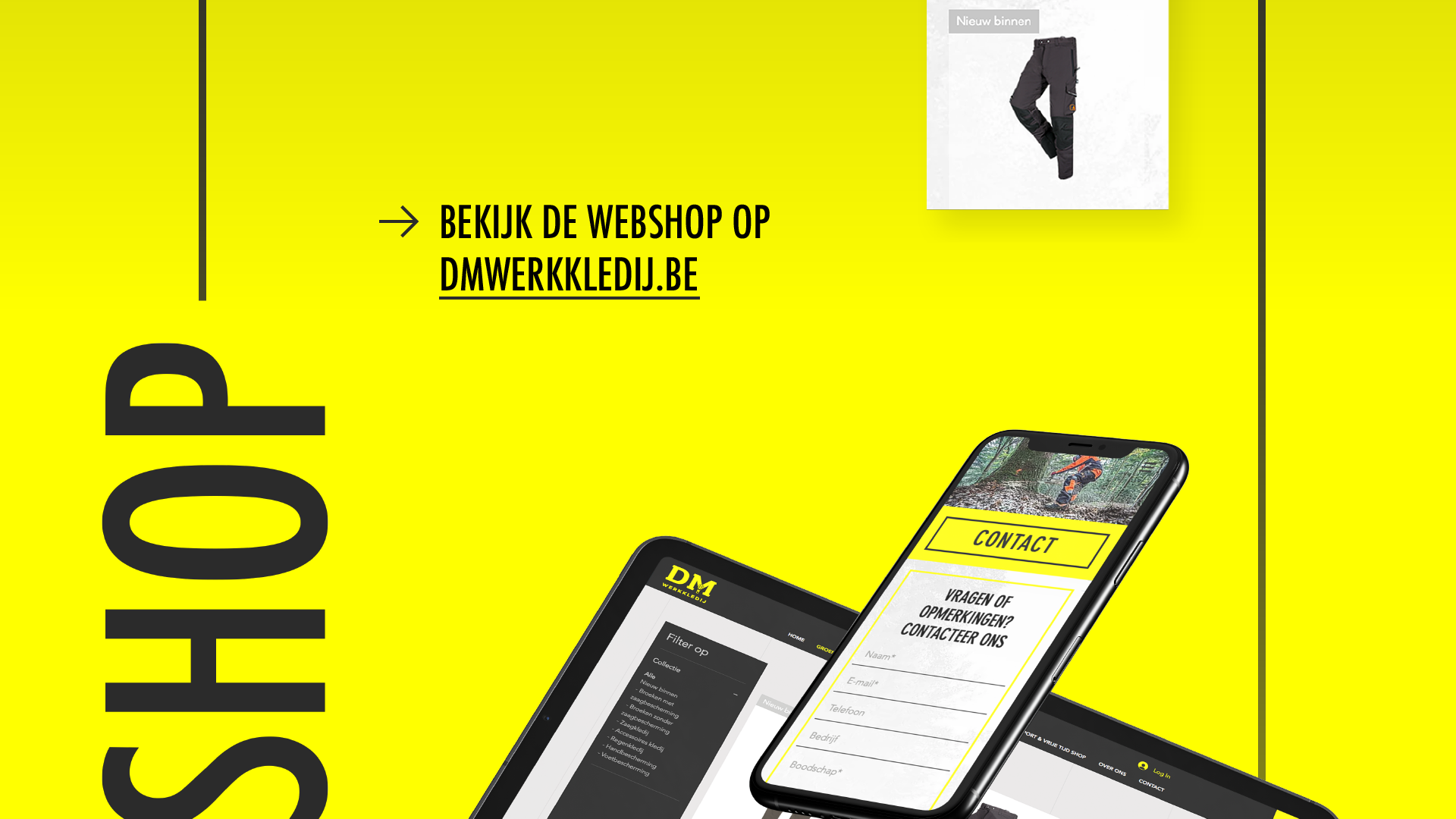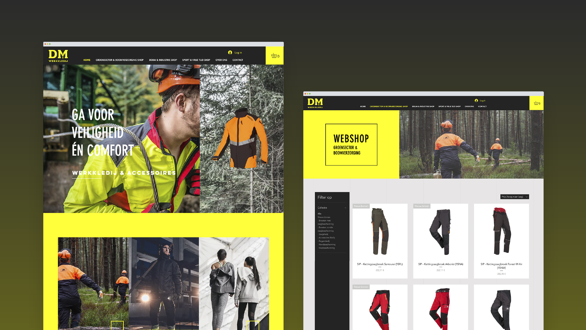 Responsive webshop voor DM Werkkledij. Volledig in eigen beheer ontworpen en opgezet via het e-commerceplatform van Wix, om zo optimaal gebruik te maken van het budget van de klant. Het aanbod bestaat uit enkel de beste merken, om zo een constante kwaliteit te leveren. Het fluogeel uit het logo werd zoveel mogelijk gebruikt en geeft de website het industriële karakter!