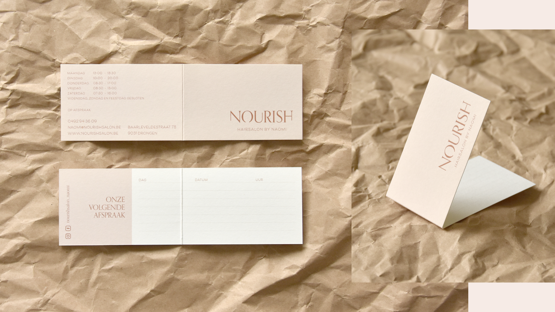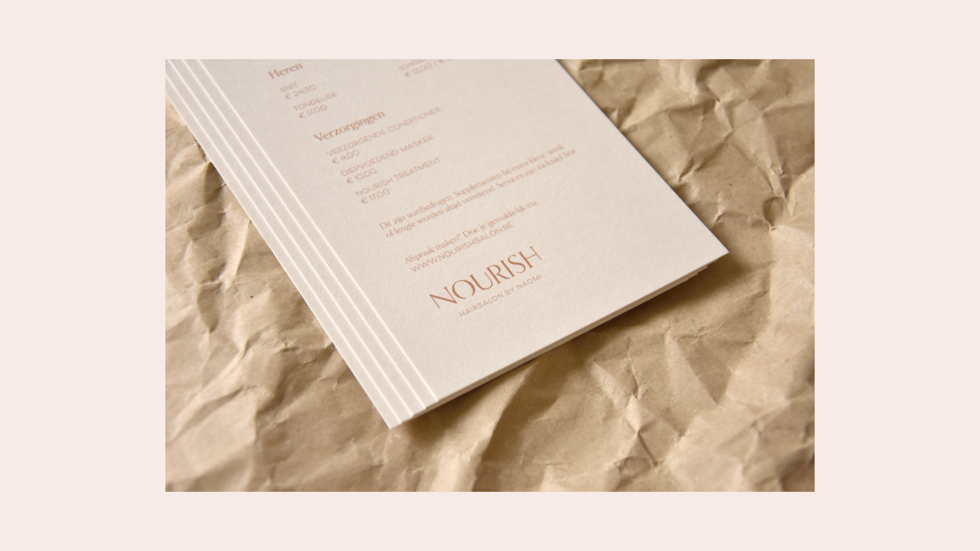 Naamcreatie, logo en huisstijl voor Nourish. Naomi is nu volledig uitgerust om haar nieuwe haarsalon uit te bouwen. Uit de letters zijn kleine, subtiele knipjes genomen, die de subtiliteit van het concept belichamen.